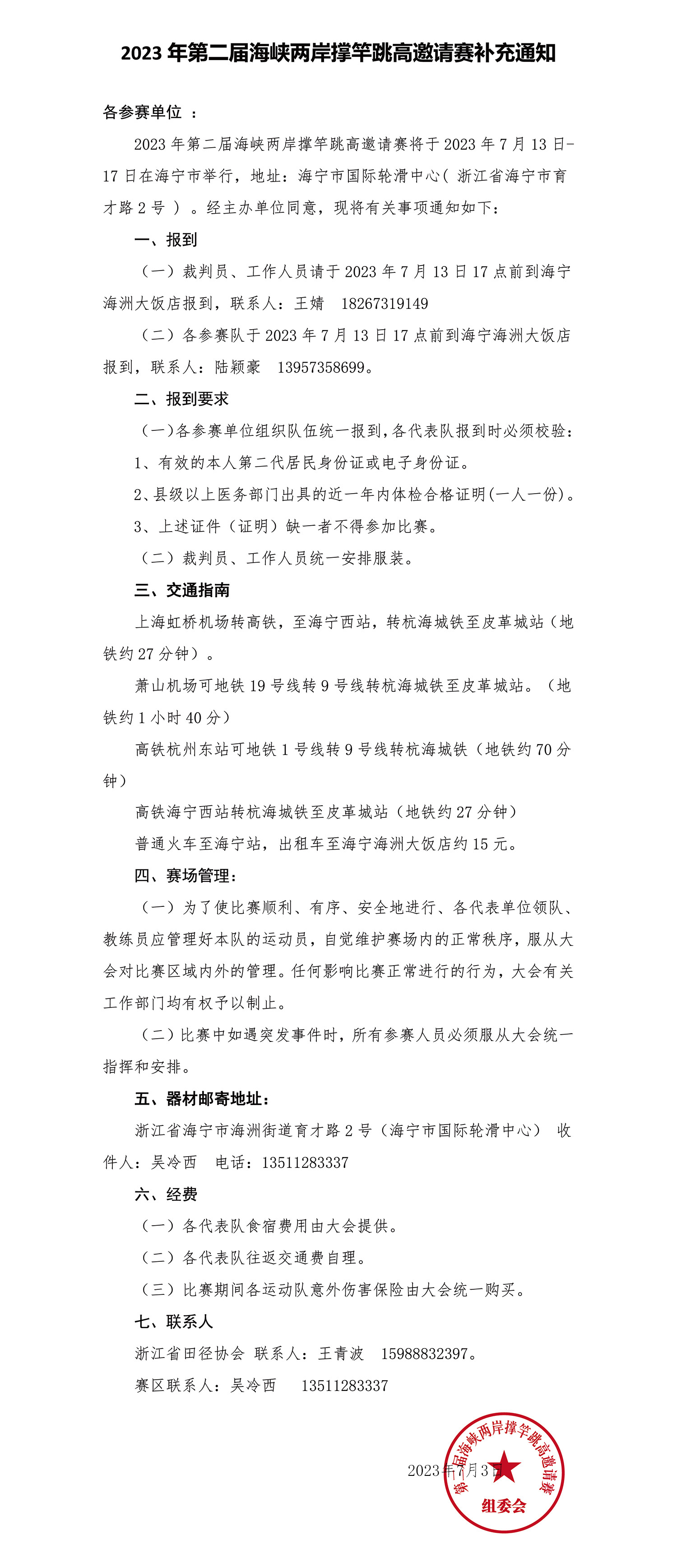 2023年第二届海峡两岸撑竿跳高邀请赛补充通知