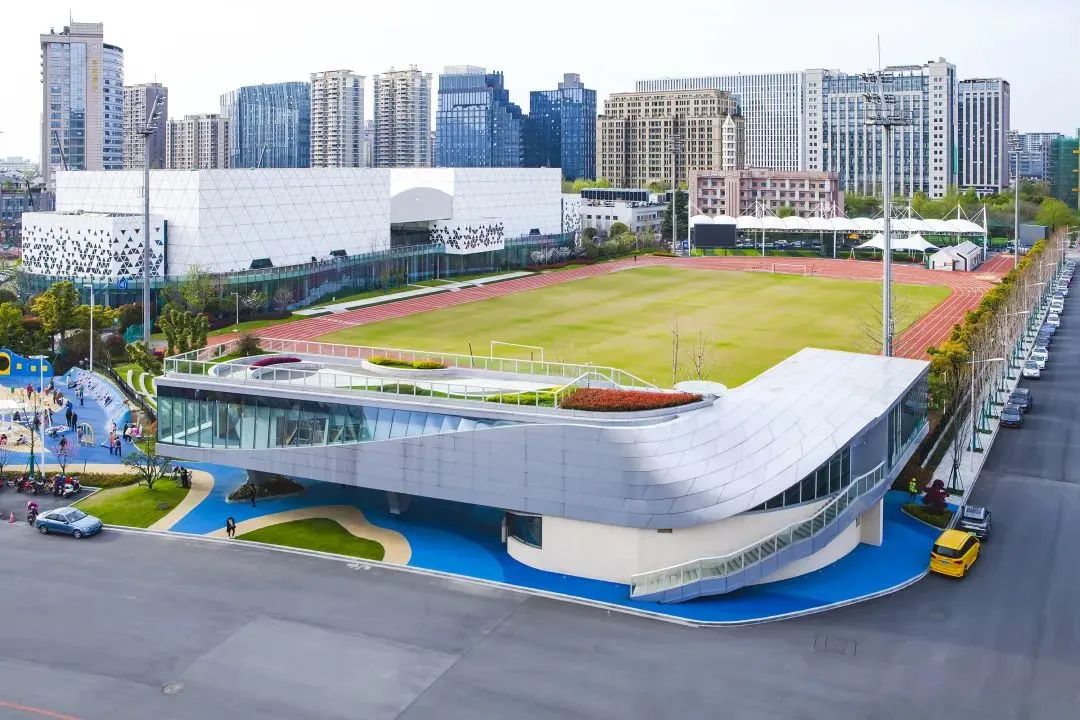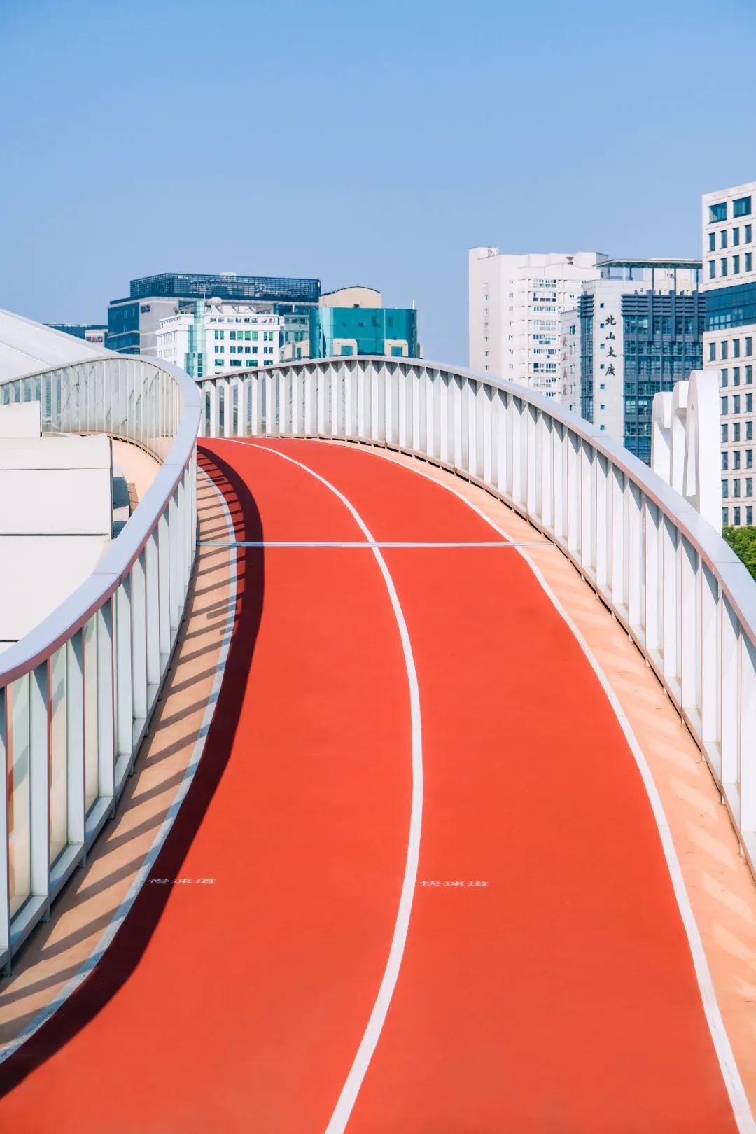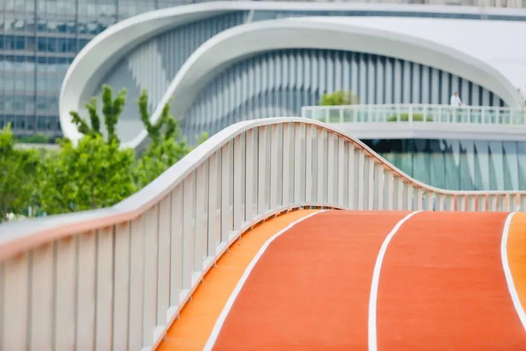 黄龙体育中心的“空中环道”集美貌与智慧于一身,不仅是优秀的运动场地,也是绝佳的观景台。“空中环道”就像一条绵延起伏的红橙色飘带,颜色亮眼夺目,线条优美流畅,它的高颜值深受市民喜爱。