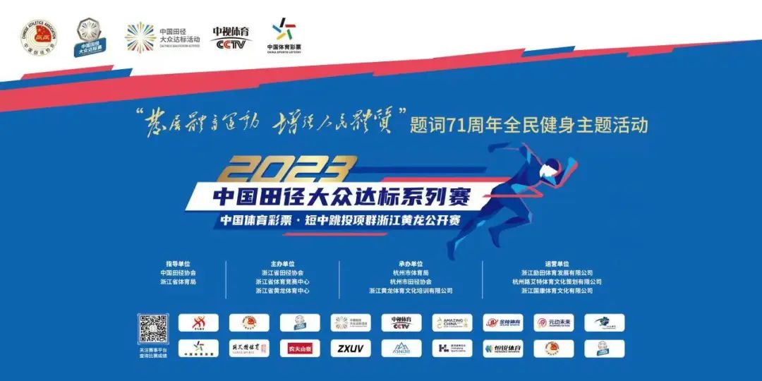 7月8日,浙江省黄龙体育中心室外田径场,由中国田径协会、浙江省体育局指导,浙江田径协会、浙江省体育竞赛中心、杭州黄龙体育中心主办,杭州市体育局、杭州市田径协会、浙江黄龙体育文化培训有限公司承办,浙江励田体育发展有限公司、杭州路艾特体育文化策划有限公司、浙江国康体育文化有限公司运营,浙江恒锐体育发展有限公司、农夫山泉股份有限公司、杭州中奥服饰有限公司、浙江奥尼捷户外用品有限公司支持的2023年中国田径大众达标系列赛暨中国体育彩票•短中跳投项群浙江黄龙公开赛届时将在这里鸣枪开跑。