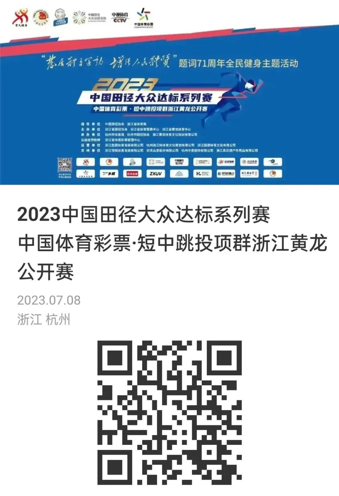 2023中国田径大众达标系列中国体育彩票•短中跳投项群浙江黄龙公开赛由中国田径协会、浙江省体育局指导,浙江省田径协会、浙江省体育竞赛中心、浙江省黄龙体育中心主办、杭州市体育局、杭州市田径协会、浙江黄龙体育文化培训有限公司承办,浙江励田体育发展有限公司、杭州路艾特体育文化策划有限公司、浙江国康体育文化有限公司运营。