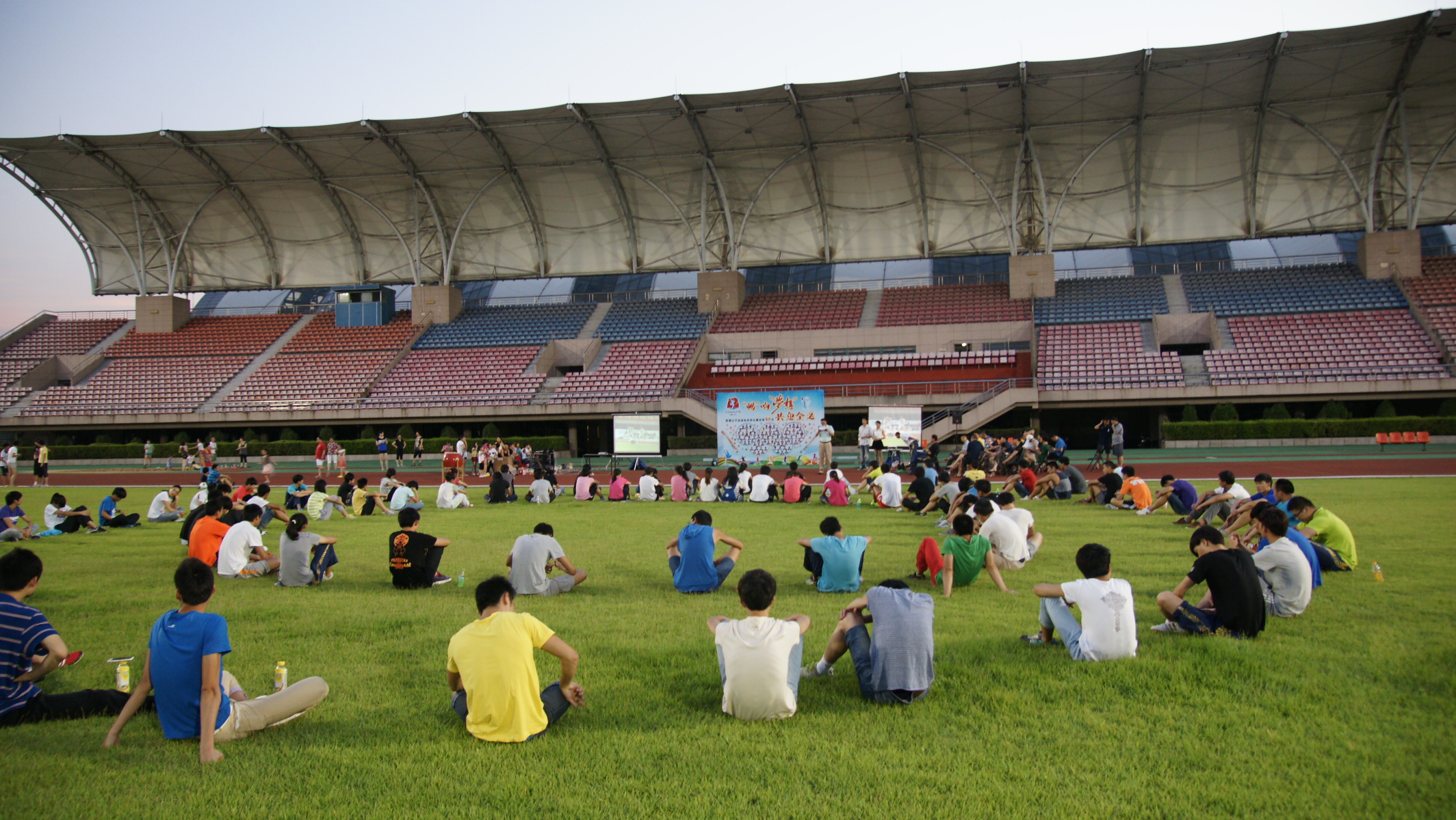 草地上,彩花在大鼓的咚咚声中传递的飞快。运动员们坐成了同心圆的造型,气氛紧张激烈,时不时传出欢呼声。400米组中得头彩,一首《朋友》道出了大家共同奋战的友情;七项全能组以一首《最初的梦想》为引子,呼吁大家要坚持自己的梦想;男子标枪运动员王青波的《爱拼才会赢》获得了全场热烈的掌声。整场活动激情洋溢、青春四射,而最后点燃梦想环节,更是将整个现场的气氛推向高潮。运动员在接受了象征性的金牌后纷纷在梦想墙前合影,期待60天后的全运决赛。