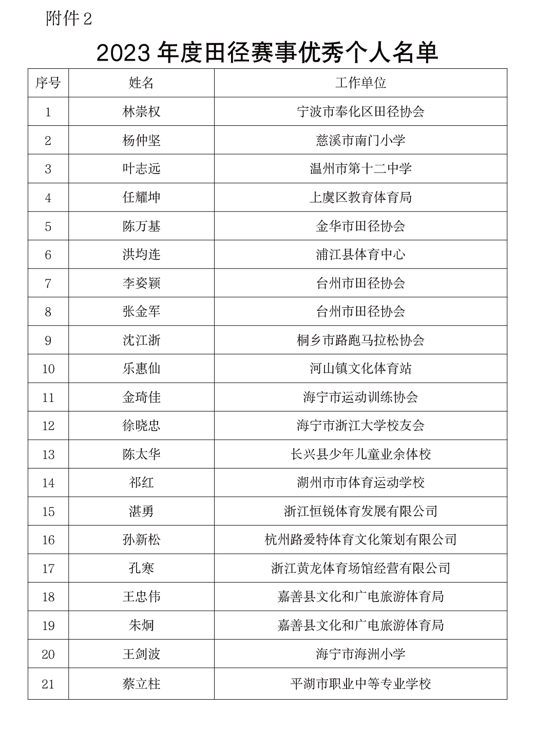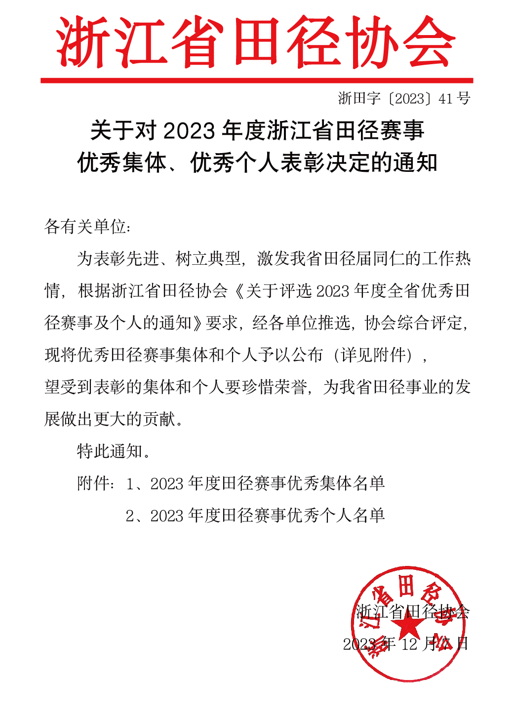 关于对2023年度浙江省田径赛事优秀集体、优秀个人表彰决定的通知