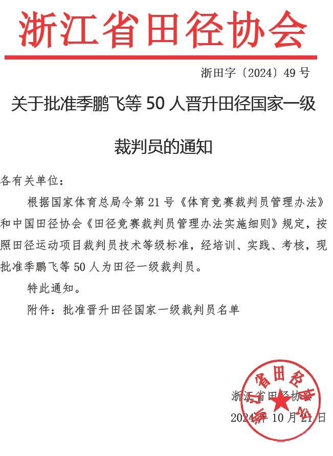 关于批准季鹏飞等50人晋升田径国家一级裁判员的通知