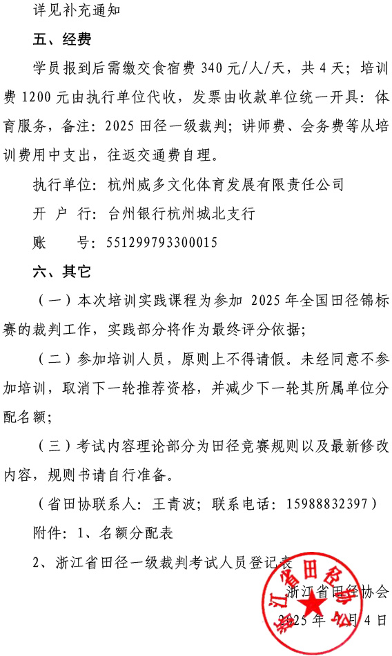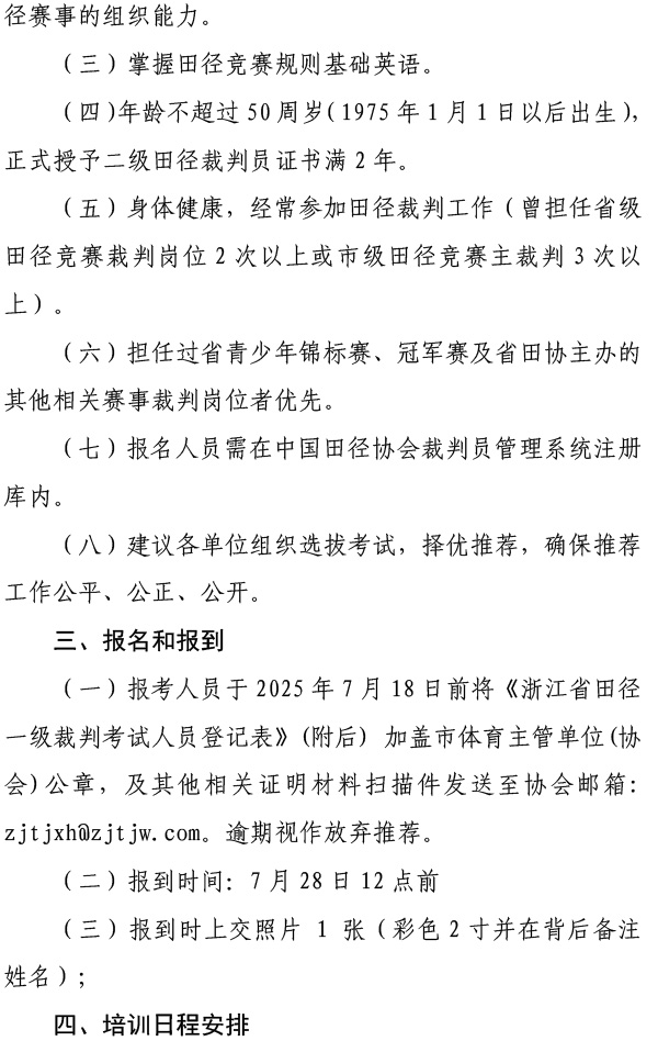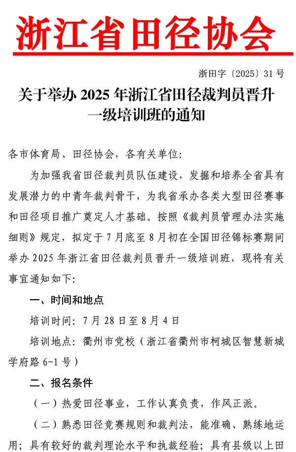 关于举办2025年浙江省田径裁判员晋升一级培训班的通知