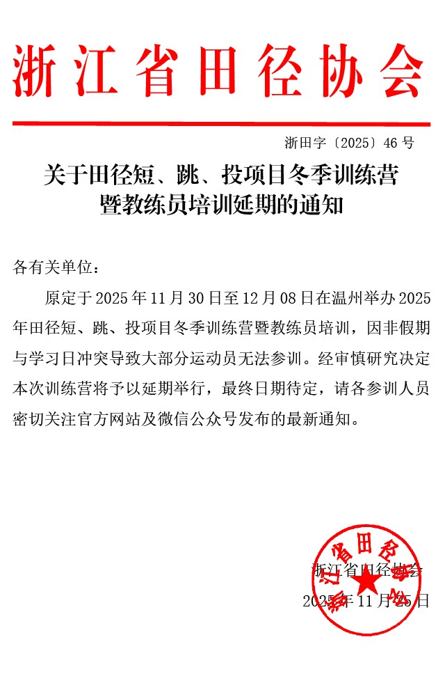 关于田径短、跳、投项目冬季训练营暨教练员培训延期的通知