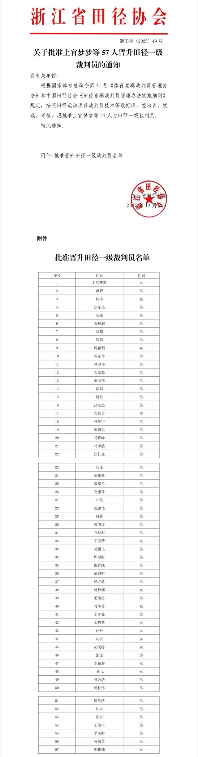 关于批准上官梦梦等57人晋升田径一级裁判员的通知