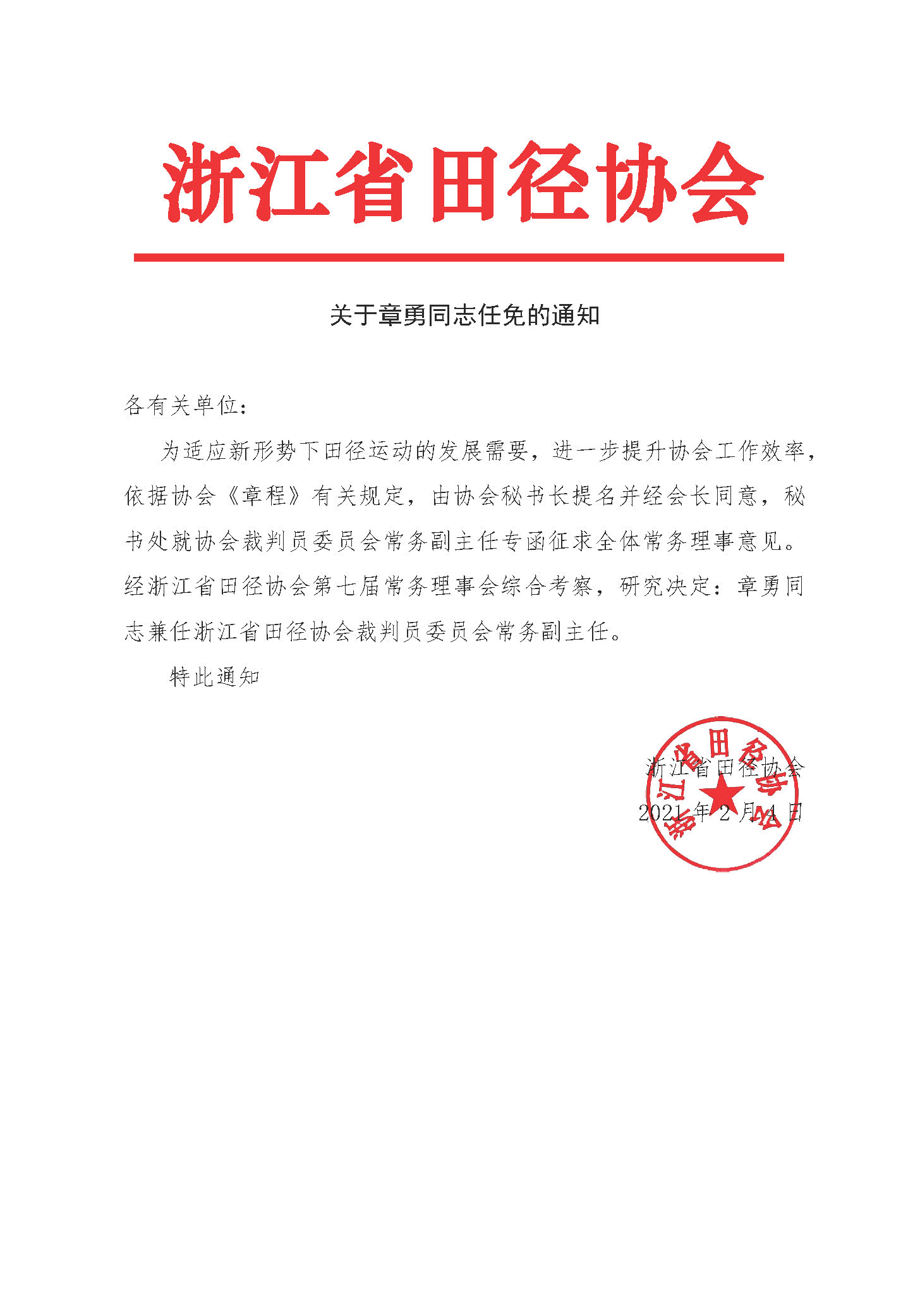 关于章勇同志任免的通知
