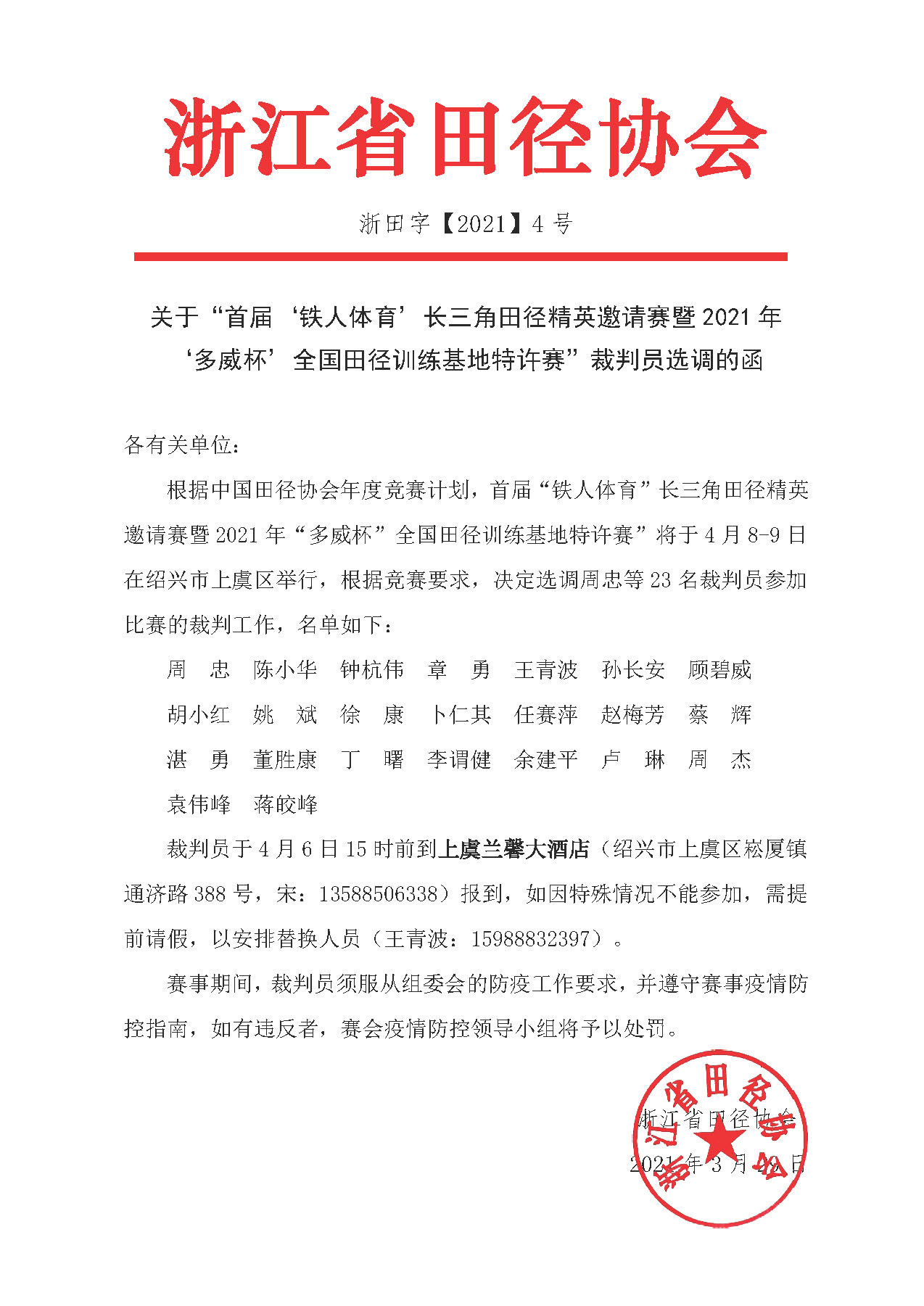 关于“首届‘铁人体育’长三角田径精英赛邀请赛暨2021年‘多威杯’全国田径训练基地特许赛”裁判员选调的函