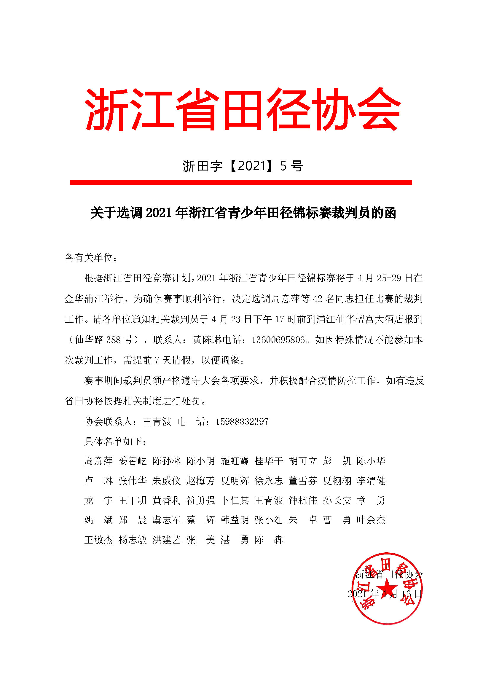 关于选调2021年浙江省青少年田径锦标赛裁判员的函