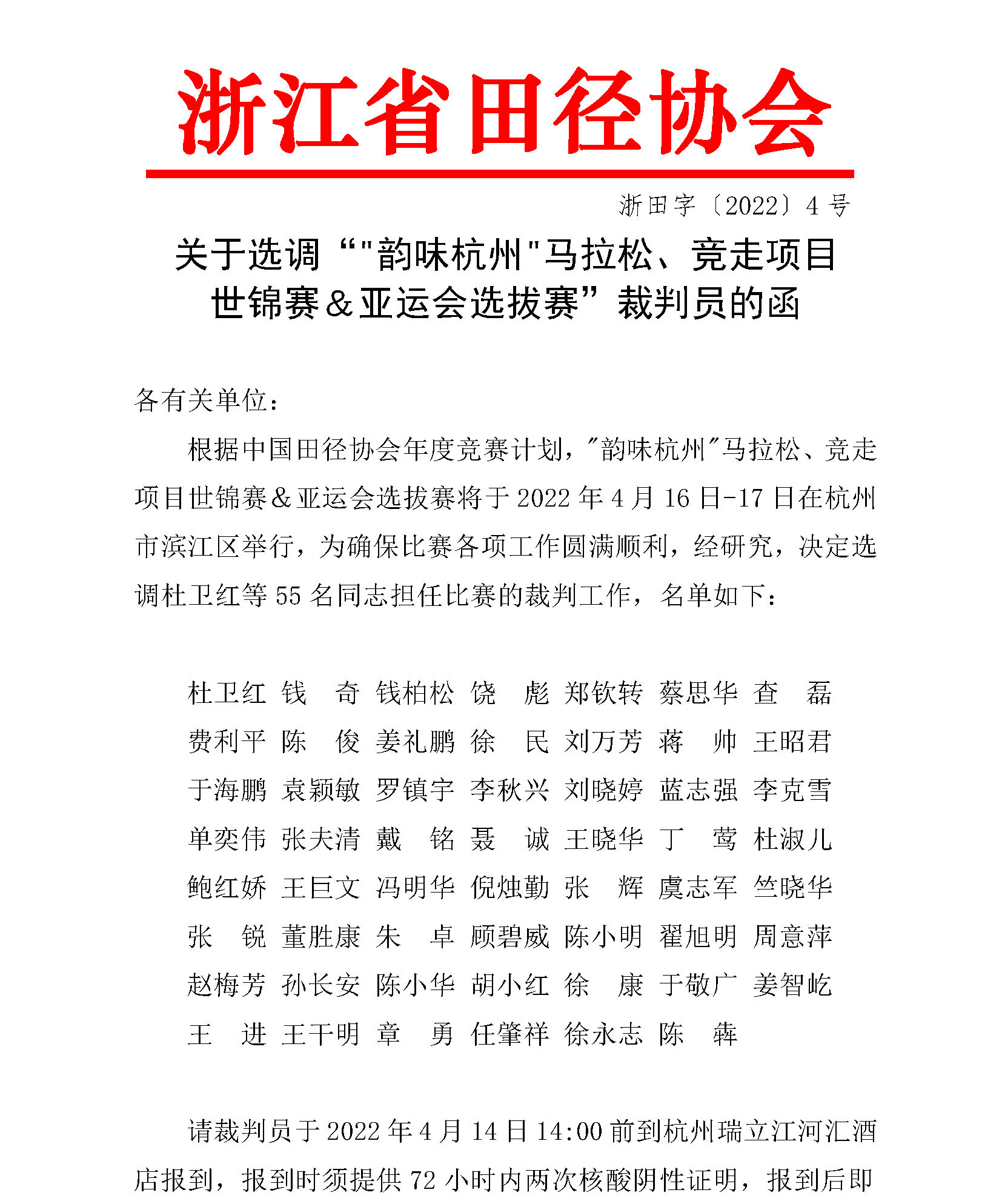关于选调“"韵味杭州"马拉松、竞走项目 世锦赛&亚运会选拔赛”裁判员的函