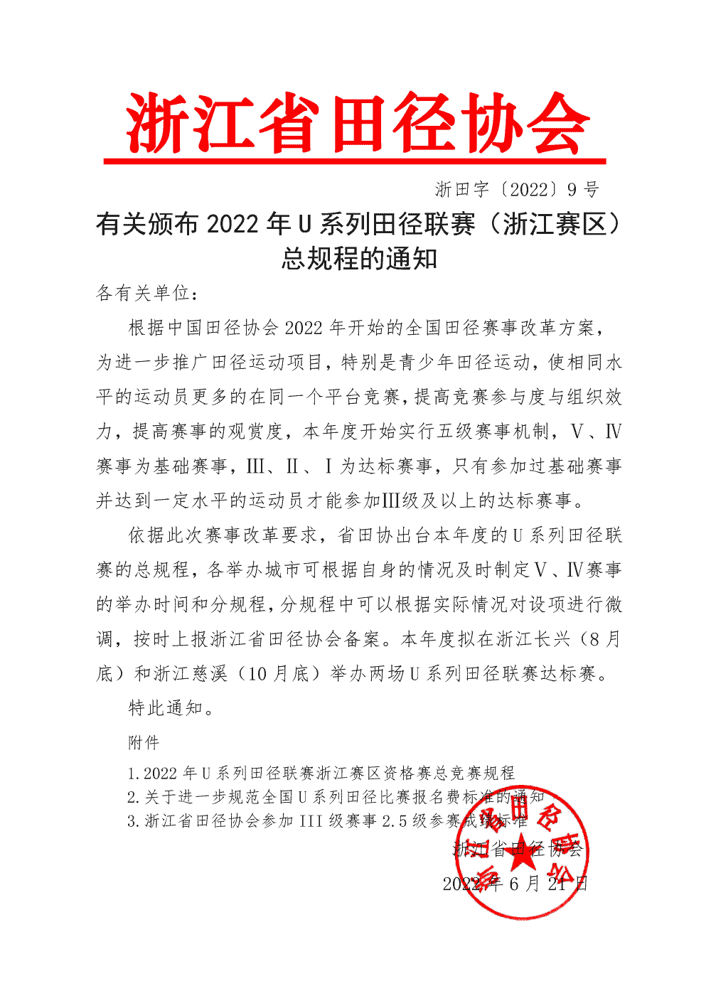 有关颁布2022年U系列田径联赛(浙江赛区)总规程的通知