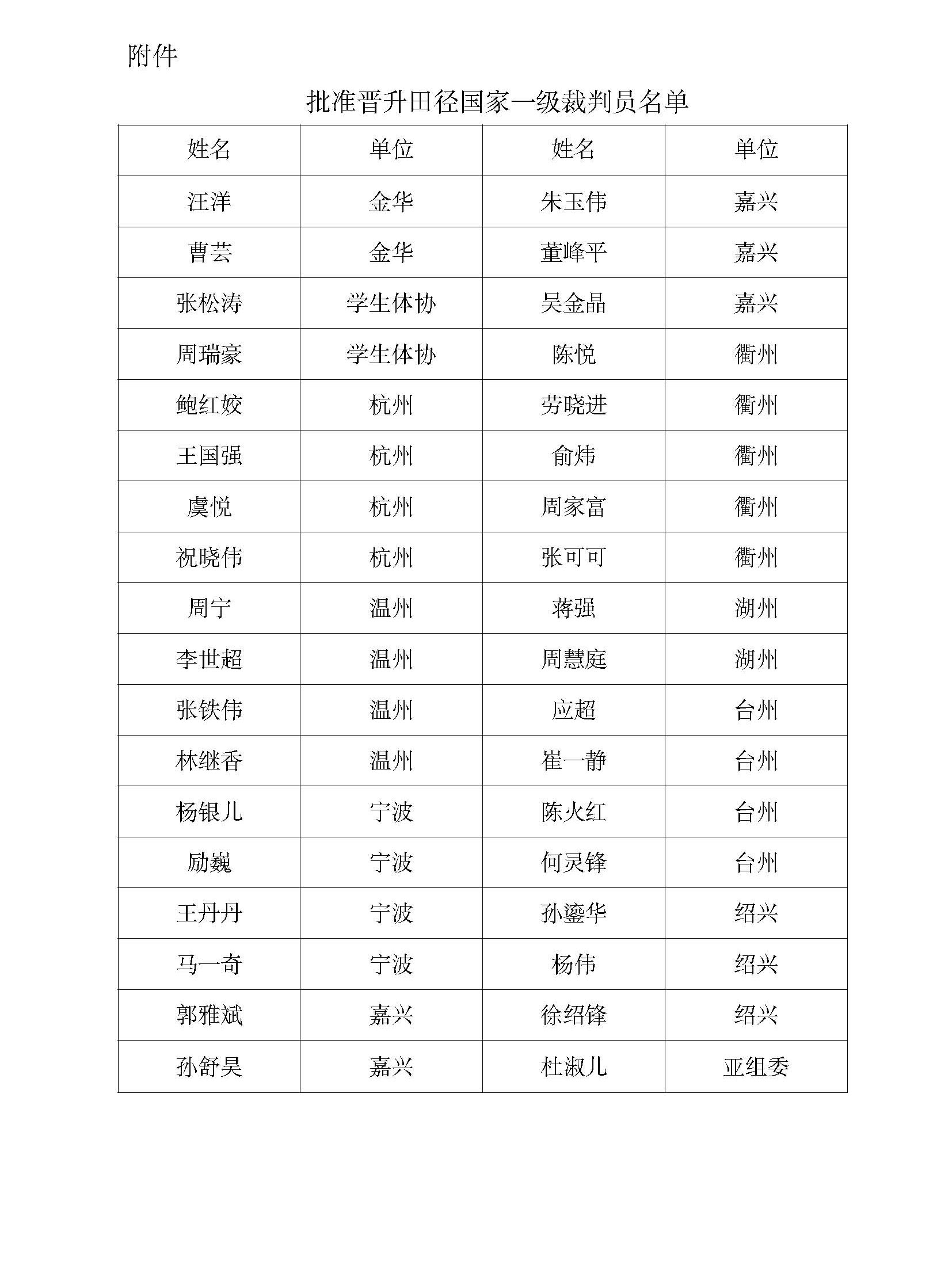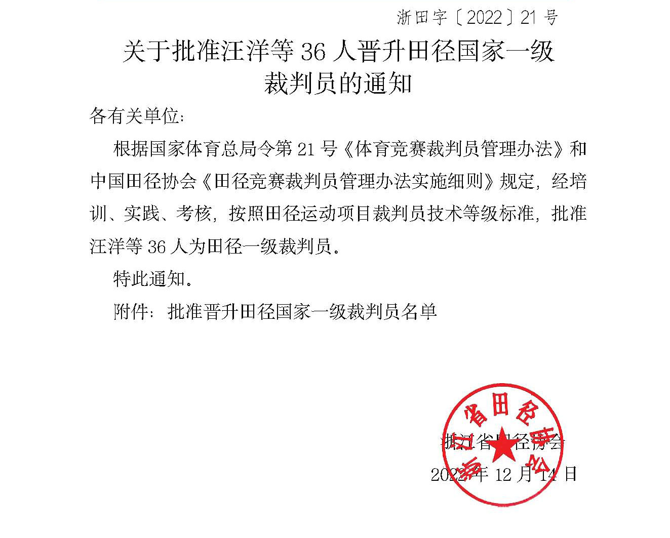 关于批准汪洋等36人晋升田径国家一级裁判员的通知