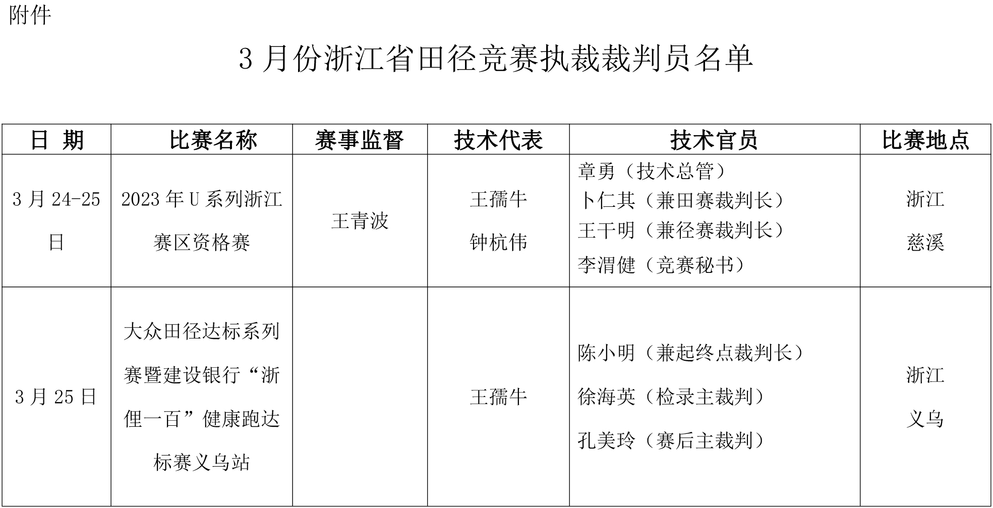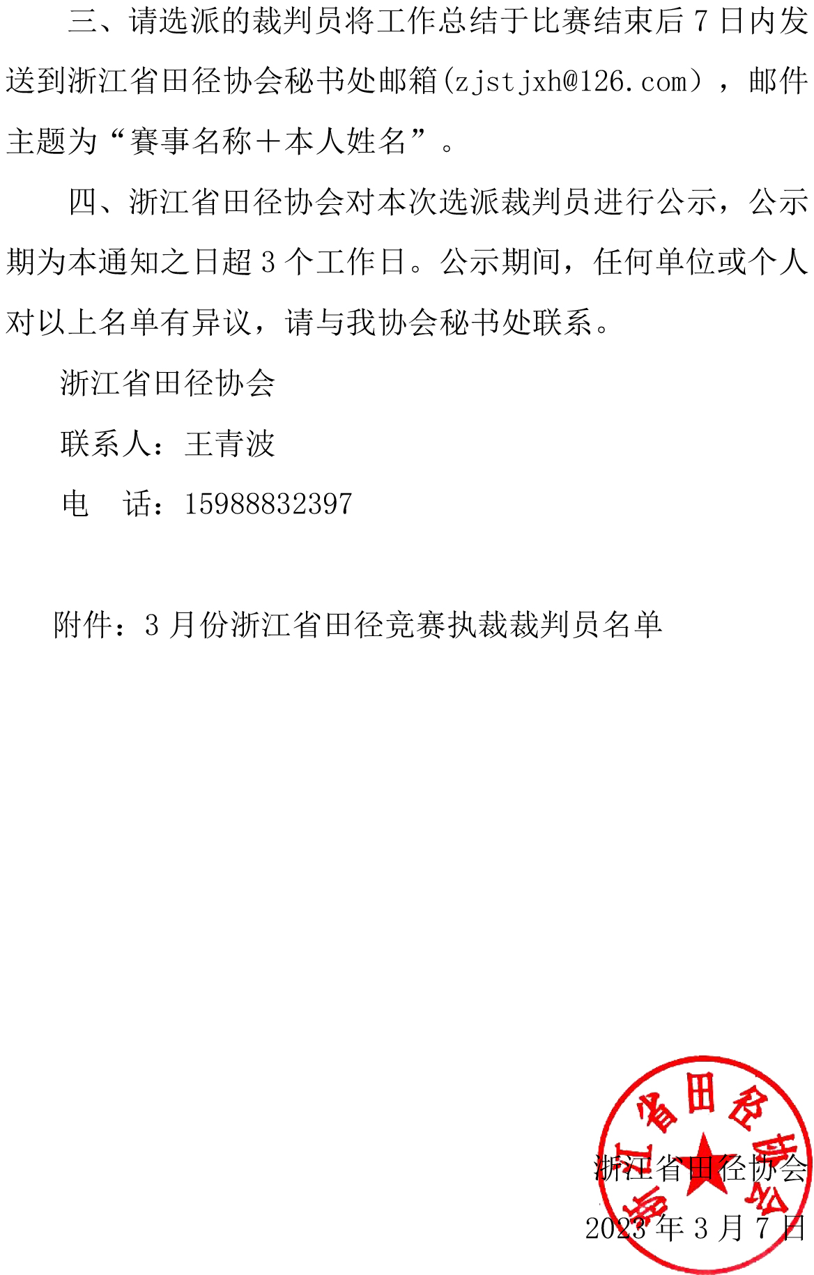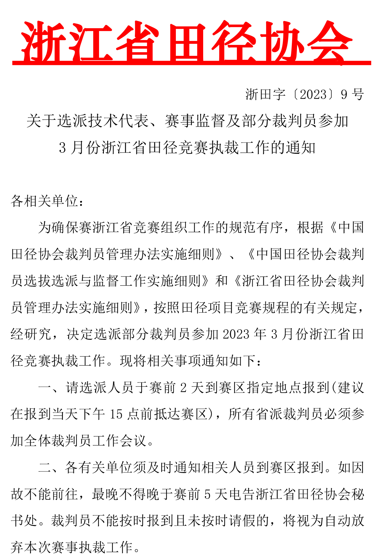 关于选派技术代表、赛事监督及部分裁判员参加3月份浙江省田径竞赛执裁工作的通知