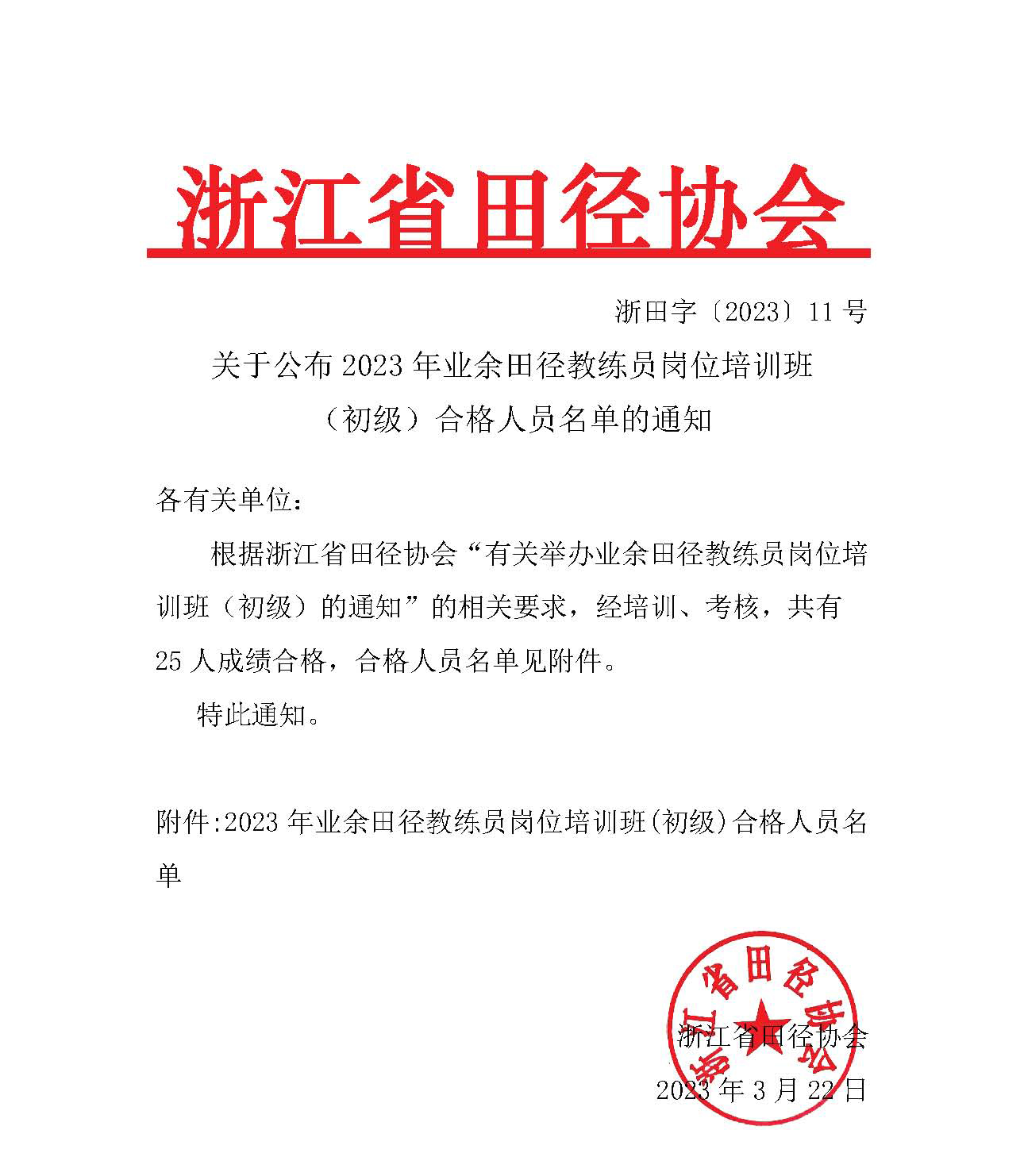 关于公布2023年业余田径教练员岗位培训班(初级)合格人员名单的通知