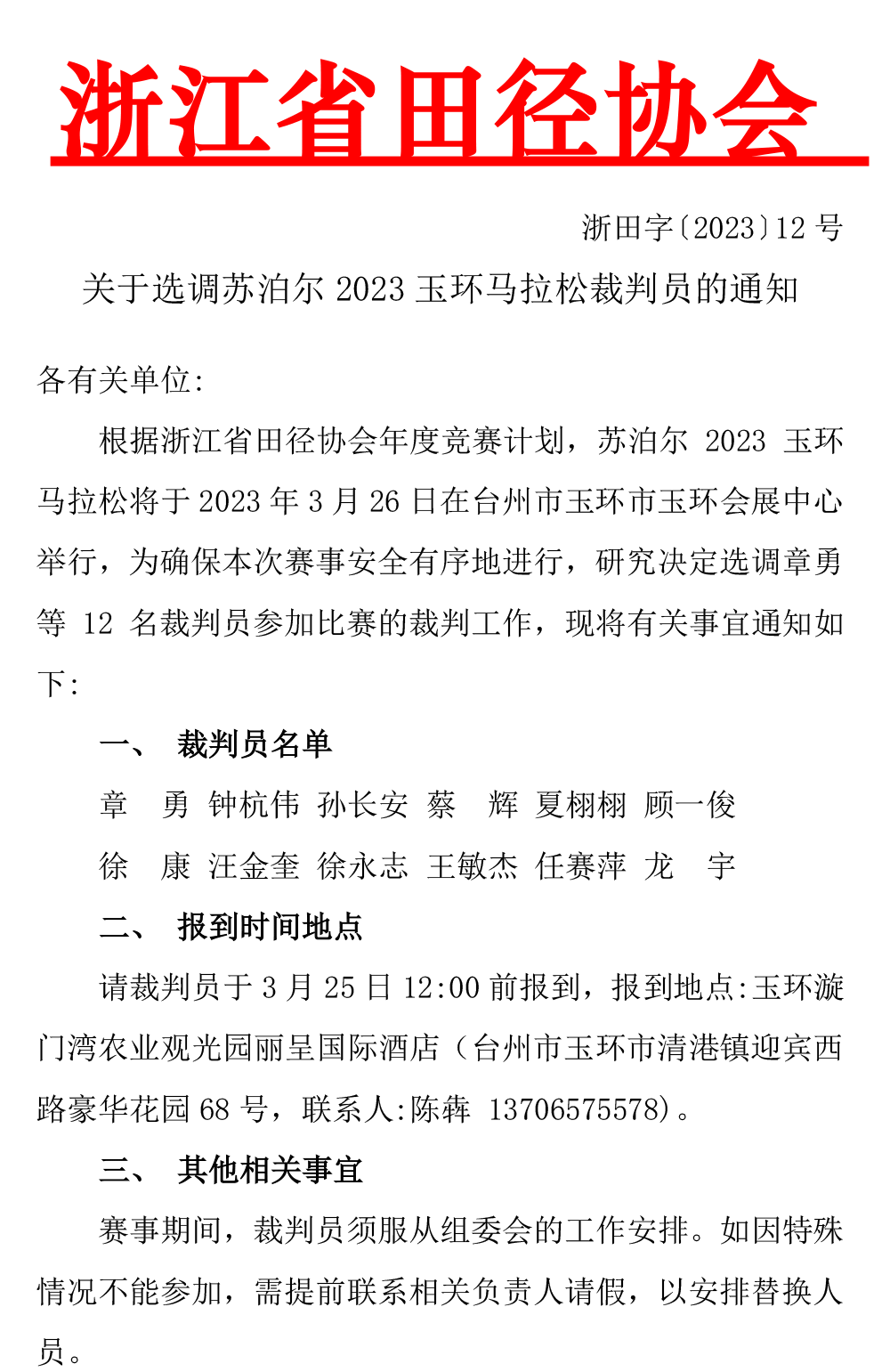 关于选调苏泊尔2023玉环马拉松裁判员的通知