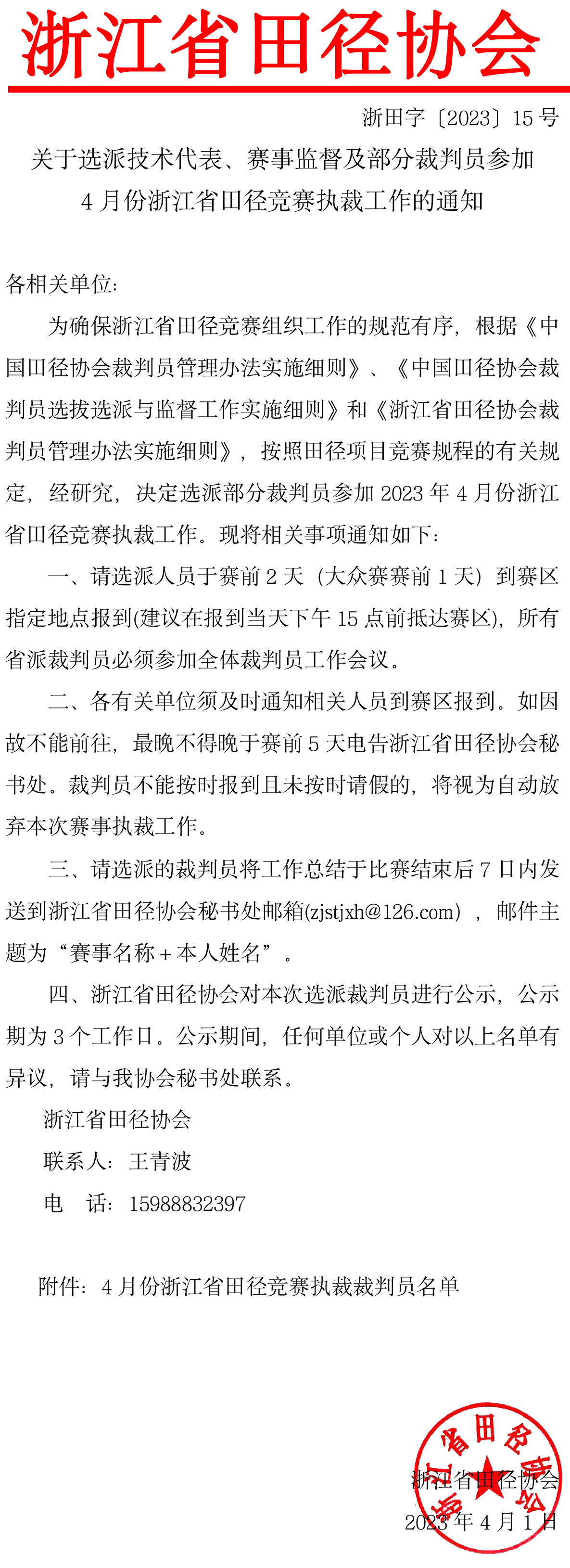 关于选派技术代表及部分裁判员参加4月份浙江省田径竞赛执裁工作的通知