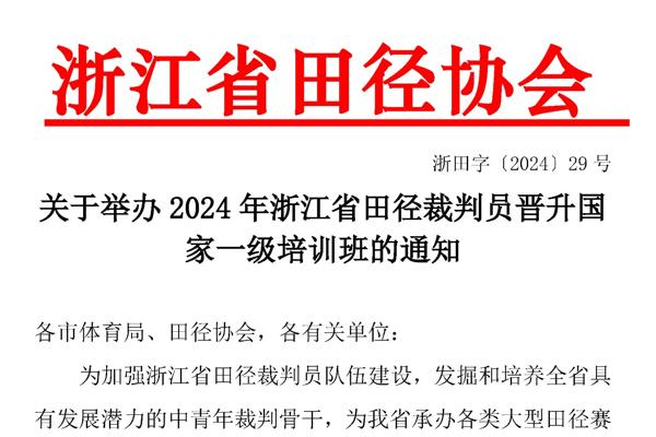 2024年8月12日 10:18 7577 - 关于举办 2024 年浙江省田径裁判员晋升国 家一级培训班的通知